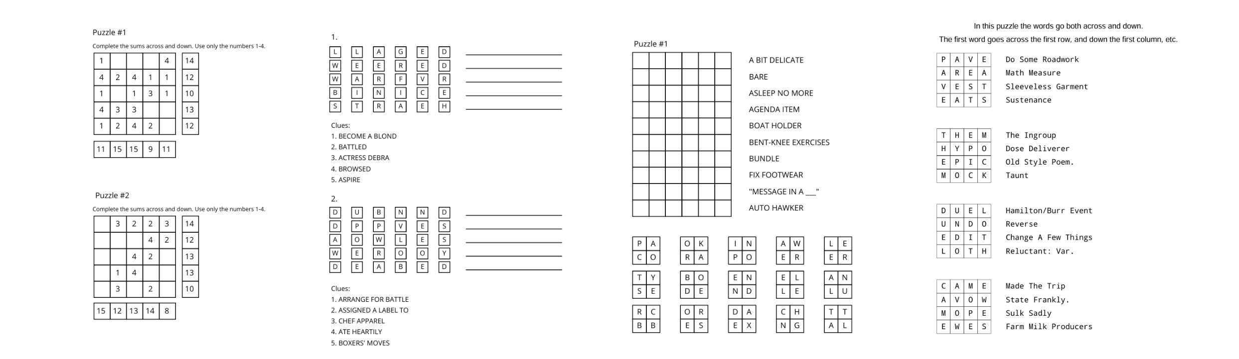 Word Squares - Using the clues, figure out the words that go in the grid. The words go both horizontal and vertical. This is a fun one!